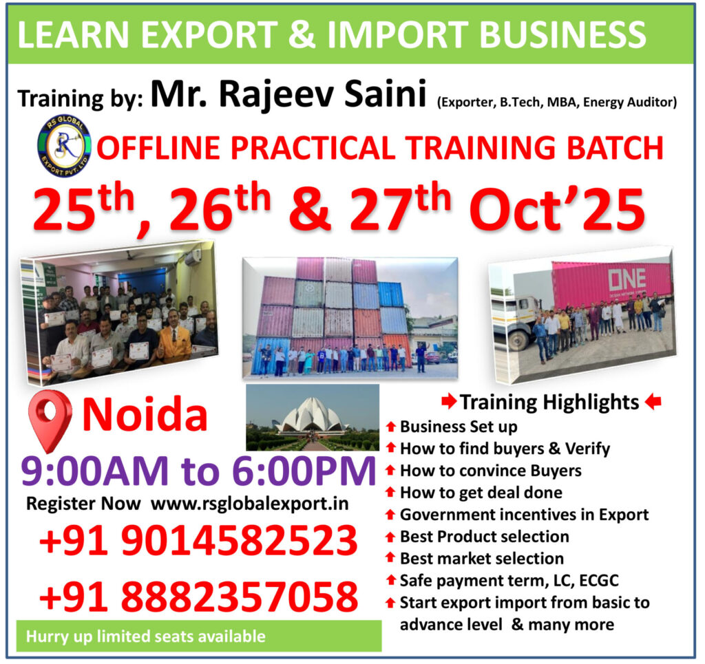 We at RS Global Export are aware of the subtleties and complexity involved in global trade. With years of experience and knowledge, we have put together thorough training programmes that provide our clients the skills they need to handle the complexities of import and export laws, logistics, paperwork, and market trends. Best Trusted export training center and trainer in India.